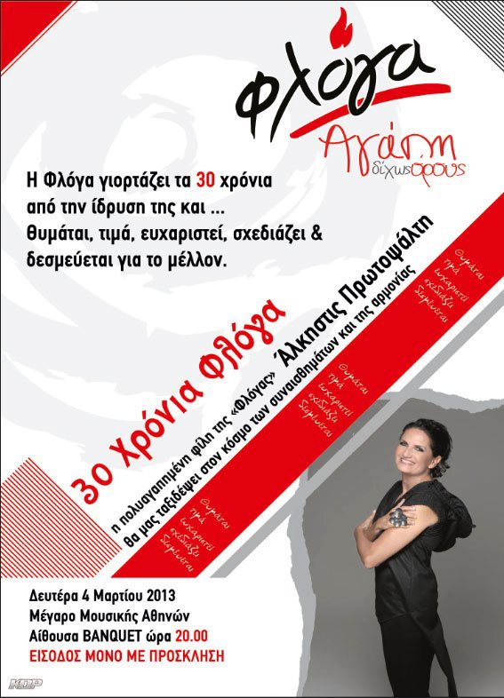 >>Σε μια πραγματική γιορτή, που θα θέλαμε να μπορούσε να φιλοξενήσει περισσότερους, έχουν προσκληθεί αγαπημένοι φίλοι και χορηγοί καθώς και οι γιατροί και νοσηλευτές μας που έχουν στηρίξει τον αγώνα της Φλόγας όλα αυτά τα 30 χρόνια. Οι εθελοντές γονείς της Φλόγας θα θυμηθούν τα δύσκολα χρόνια που άναψε η πρώτη σπίθα, θα ευχαριστήσουν και θα τιμήσουν τους χορηγούς, ενώ η εκδήλωση θα κλείσει με την πολυαγαπημένη φίλη της Φλόγας Άλκηστη Πρωτοψάλτη, που προσφέρθηκε να λαμπρύνει τη βραδιά μας σ’ ένα πρόγραμμα με αγαπημένα τραγούδια.
