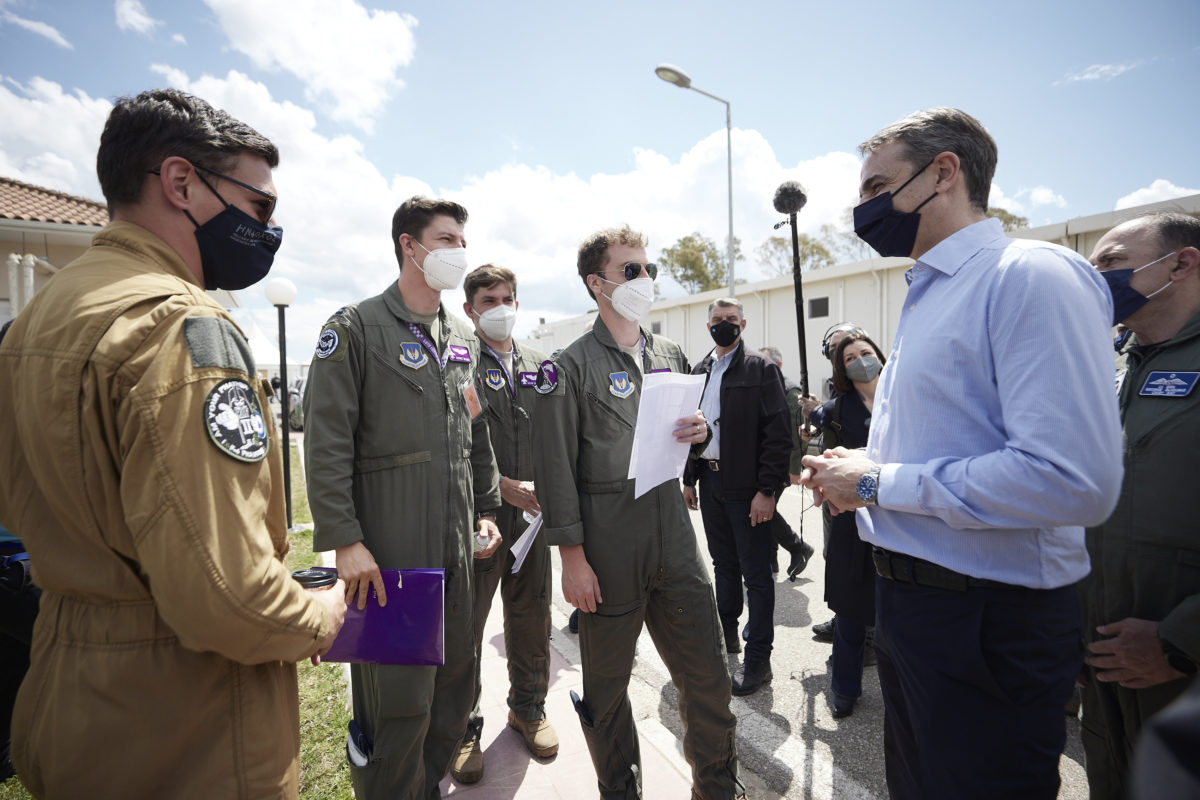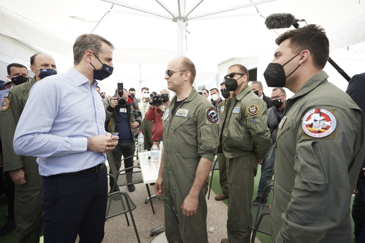 Λίγο πριν ολοκληρωθεί η επίσκεψή του στην Ανδραβίδα, ο πρωθυπουργός είχε μια σύντομη αλλά πολύ θερμή συνομιλία με τους πιλότους που υπηρετούν στην 347 μοίρα της 111 πτέρυγα Μάχης, στον Αλμυρό Μαγνησίας, εκεί όπου πριν από 29 χρόνια (στην 111 Πτέρυγα Μάχης και στην 346 τότε μοίρα) ο Κυριάκος Μητσοτάκης υπηρέτησε το σύνολο της στρατιωτικής του θητείας.