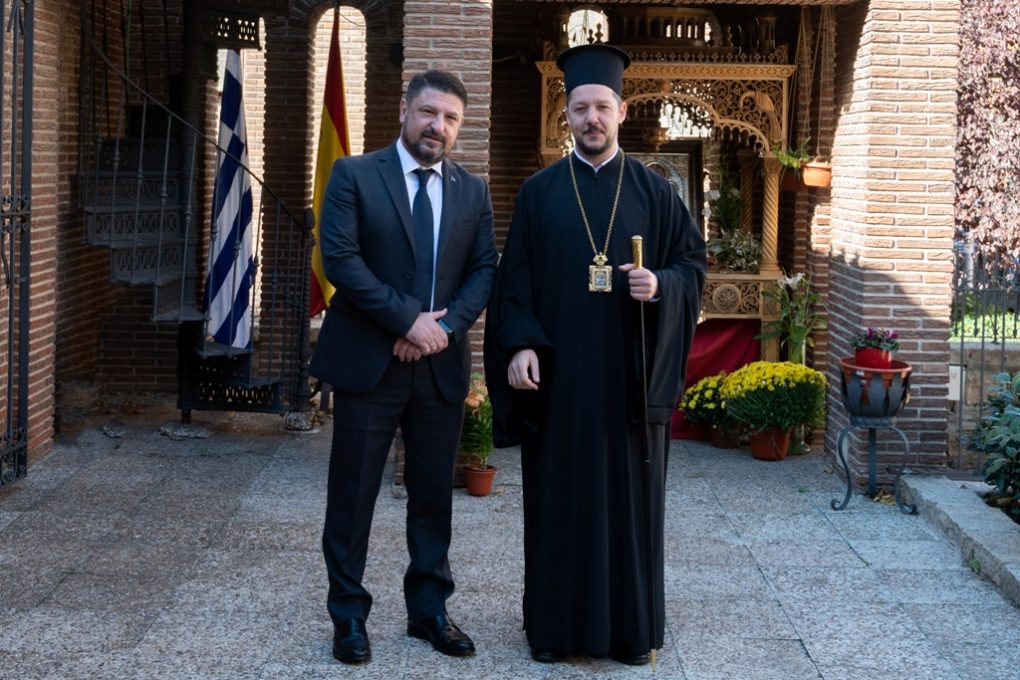 Επίσης, ο Υφυπουργός Εθνικής Άμυνας κατά τη διάρκεια της επίσκεψής του πραγματοποίησε εθιμοτυπική συνάντηση με τον Σεβασμιότατο Μητροπολίτη Ισπανίας και Πορτογαλίας κ.κ. Βησσαρίωνα, στην έδρα της Μητρόπολης, στον Ιερό Μητροπολιτικό Ναό Αγίων Ανδρέα και Δημητρίου στη Μαδρίτη.