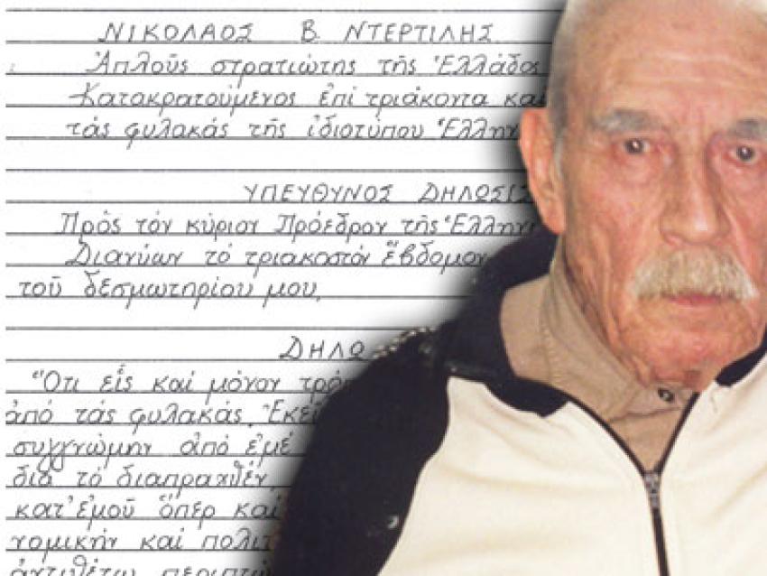 Μίλησα τηλεφωνικά με τον Νίκο Ντερτιλή. Θυμάμαι η τελευταία ερώτηση ήταν αν εκείνος σκόπευε κάποια στιγμή να υποβάλλει αίτηση αποφυλάκισης. “Το δικό μου αποφυλακιστήριο θα μου το καρφώσουν στο φέρετρο”, μου είχε πει! Όπως έλεγε δεν ήθελε ποτέ να “νομιμοποιήσει το καθεστώς”. Δικαίωμά του…