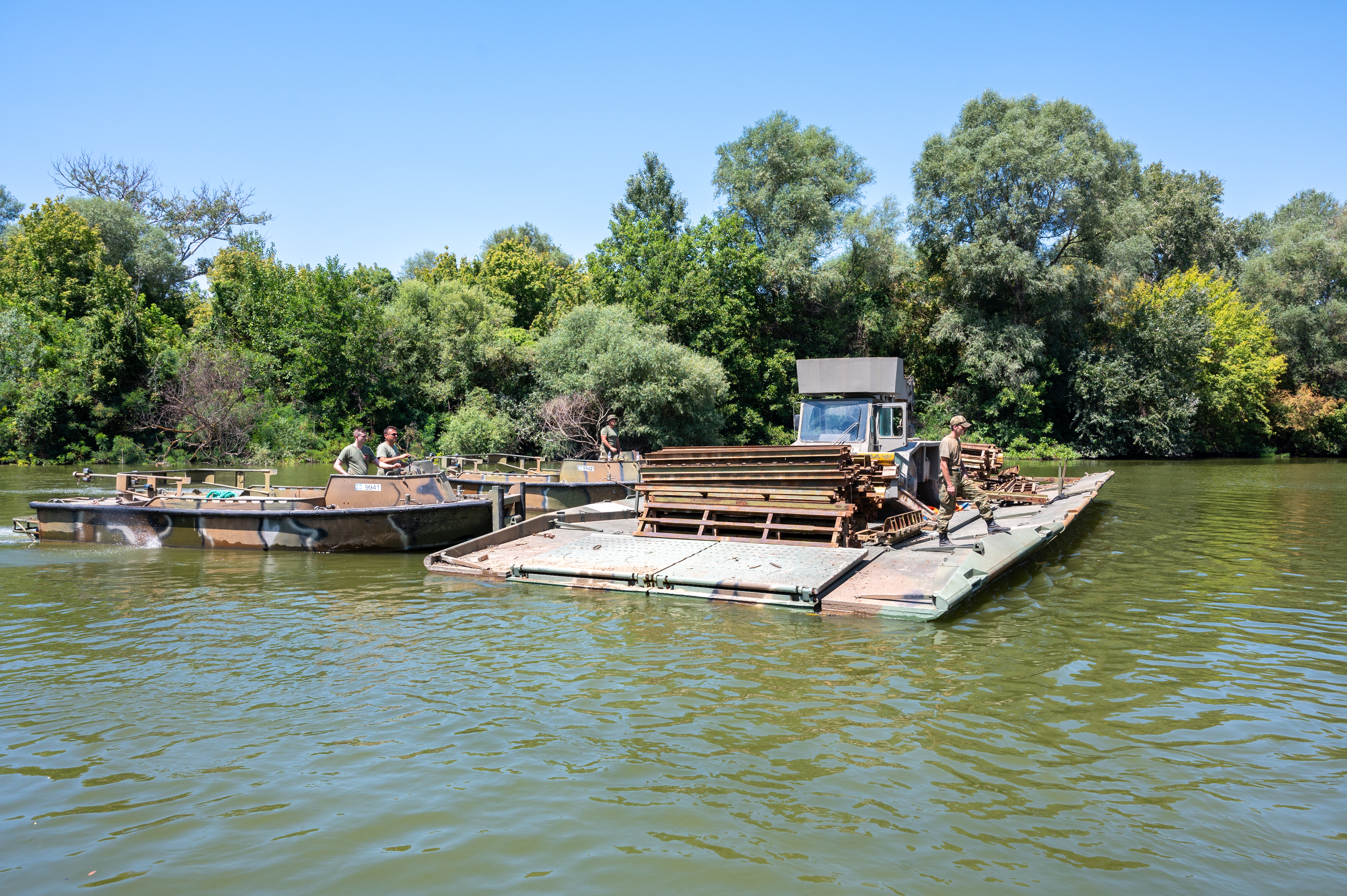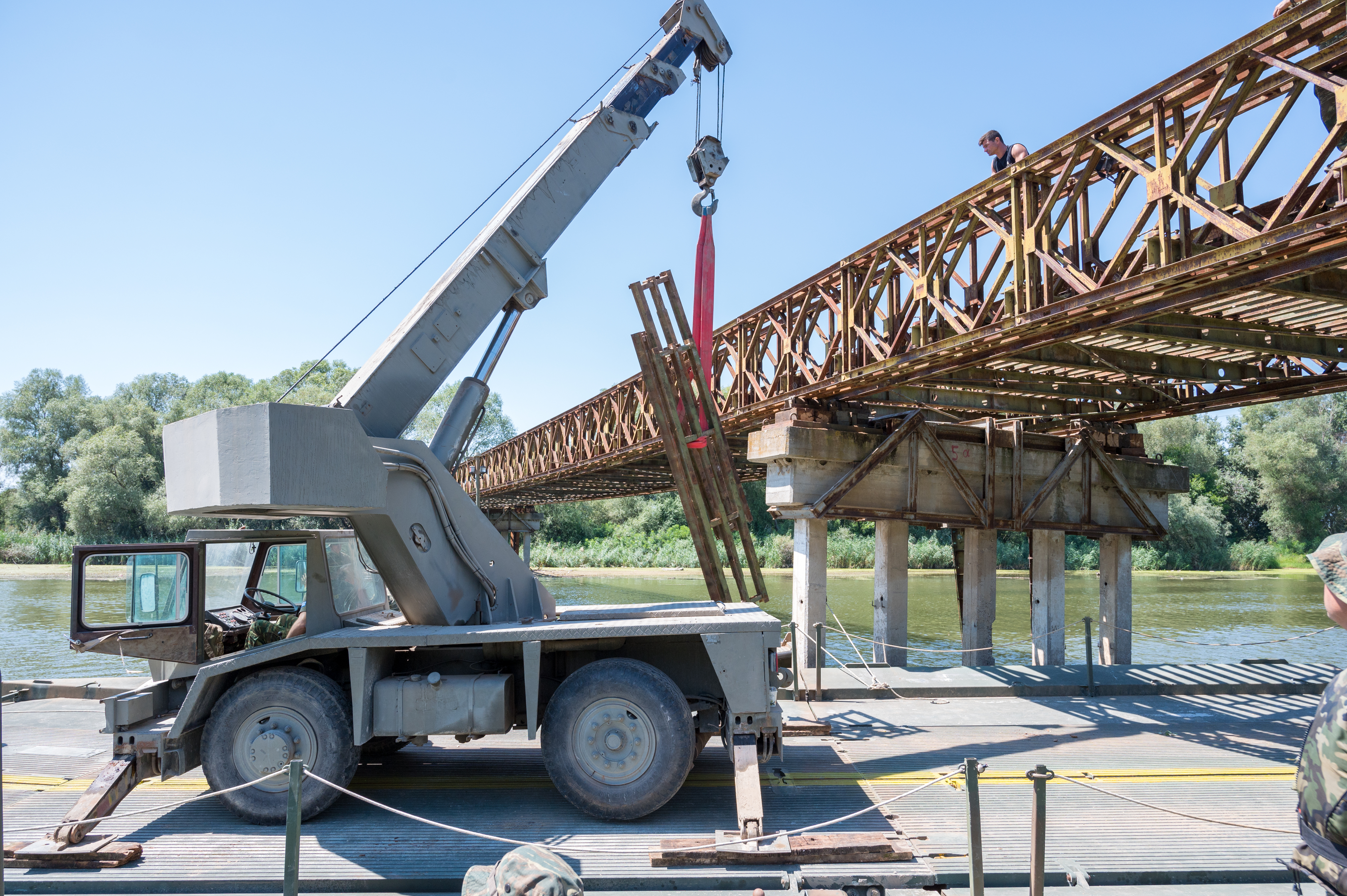 Έπειτα, μια μεγάλη μπουλντόζα βάρους 22 τόνων με ισχύ 240 HP ρυμούλκησε τη γέφυρα προς την όχθη. Τα πλωτά μεσόβαθρα κράτησαν το φορτίο. Η διαδικασία συνεχίστηκε και μέσα στο σκοτάδι. Υπήρχε πάντα διαθέσιμο εφεδρικό υπόβαθρο για λόγους ασφαλείας και συνδρομή σε περίπτωση ανάγκης. Τα πλωτά μεσόβαθρα αποσυναρμολογήθηκαν και όλο το υλικό μεταφέρθηκε σε χώρο φύλαξης Μονάδας του Μηχανικού.