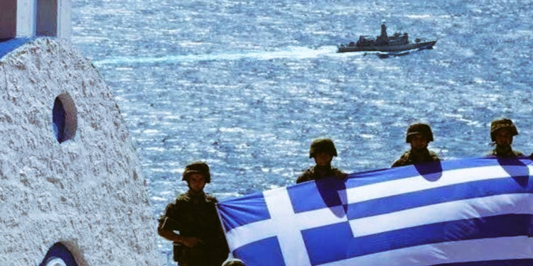 Ο κ. Χαρδαλιάς συνοδεύει την ανάρτηση του με μια φωτογραφία με στρατιώτες να κρατούν την ελληνική σημαία δίπλα σε ένα εκκλησάκι σε κάποιο νησί του αρχιπελάγους, ενώ στο βάθος διακρίνεται η διέλευση ενός πλοίου του στόλου.