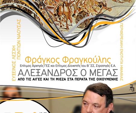 H Εύξεινος Λέσχη Νάουσας διοργανώνει, υπό την αιγίδα της Π.Ε Ημαθίας, εκδήλωση με ομιλητή τον Επίτιμο Αρχηγό ΓΕΣ και Επίτιμο Διοικητή του Β΄ΣΣ, Στρατηγού εν αποστρατεία. κ.Φράγκου Φραγκούλη. Το θέμα της ομιλίας του κ.Φράγκου είναι «Αλέξανδρος ο Μέγας. Από τις Αιγές και τη Μίεζα στα πέρατα της οικουμένης». Η εκδήλωση θα πραγματοποιηθεί στο Κέντρο Τεκμηρίωσης Βιομηχανικής Κληρονομιάς «ΕΡΙΑ» της Νάουσας, την Τρίτη 24 Νοεμβρίου 2015, στις 7 το απόγευμα.