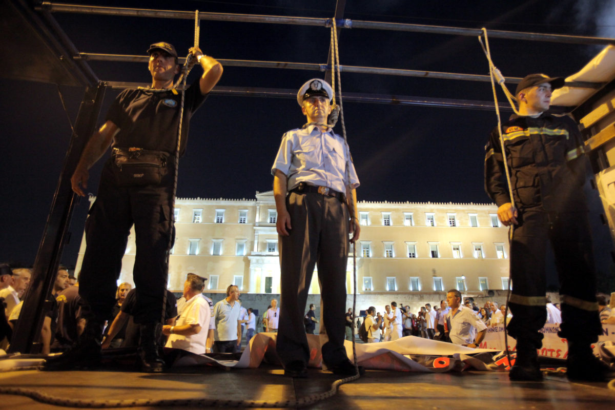 Στην “κρεμάλα” οδηγούνται οι στρατιωτικοί και το προσωπικό των Σωμάτων Ασφαλείας, επιβεβαιώνοντας τις “κρεμάλες” που συμβολικά είχαν στήσει απέναντι από τη Βουλή και έξω από το υπουργείο Οικονομικών.