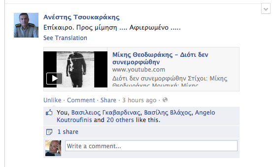 Ίσως λοιπόν το βίντεο που «ανέβασε» στο face book να αποδειχτεί και προφητικό. Όπως γράφει ο ίδιος είναι επίκαιρο και …αφιερωμένο. Που το αφιερώνει; Έχει κανείς αμφβολία ότι η αφιέρωση ανήκει αποκλειστικά στον Α/ΓΕΕΘΑ; ΄Οπως και να ‘χει το τραγούδι του μεγάλου Μίκη Θεοδωράκη είναι εξαιρετικό. Απολάυστε το.