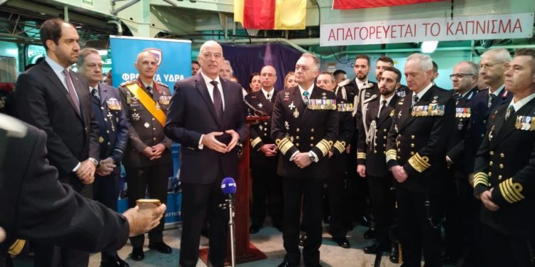 Κατά την επίδοση αναμνηστικού δώρου στον Αρχηγό ΓΕΝ και παραδίδοντα Αρχηγό Στόλου, στην τελετή που έγινε στη Φρεγάτα «Ύδρα», ο κ. Δένδιας ανέφερε: «Κύριε Αρχηγέ, κατ’ αρχάς, ως είθισται, να σας επιδώσω τον θυρεό του Υπουργείου, αλλά θα μου επιτρέψετε, πέραν αυτού να πω δυο λόγια, τα οποία θεωρώ ότι είναι μεγάλη ευκαιρία που λέγονται σε αυτήν την τελετή παράδοσης και παραλαβής της Αρχηγίας του στόλου, και μάλιστα επί της Φρεγάτας «Ύδρα».