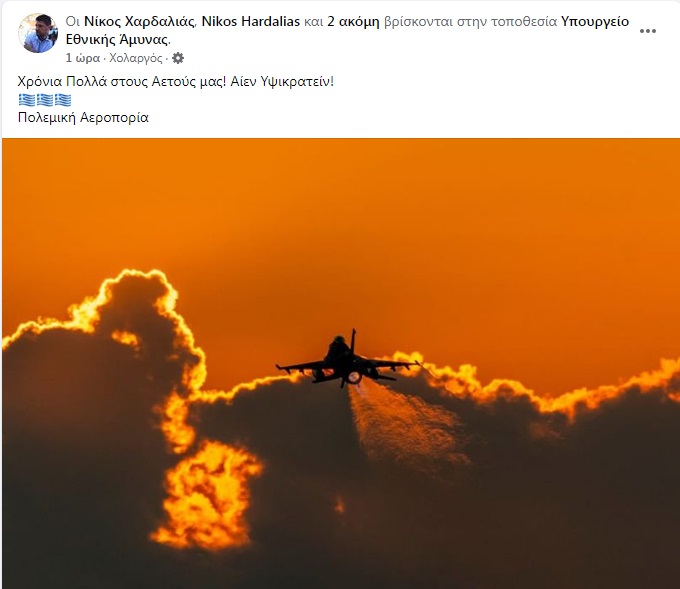 «Χρόνια Πολλά στους Αετούς μας! Αίεν Υψικρατείν!», έγραψε στον προσωπικό λογαριασμό του στο Twitter ο υφυπουργός Εθνικής Άμυνας Νίκος Χαρδαλιάς με την ευκαιρία της σημερινής εορταστικής για την Πολεμική Αεροπορία ημέρας.