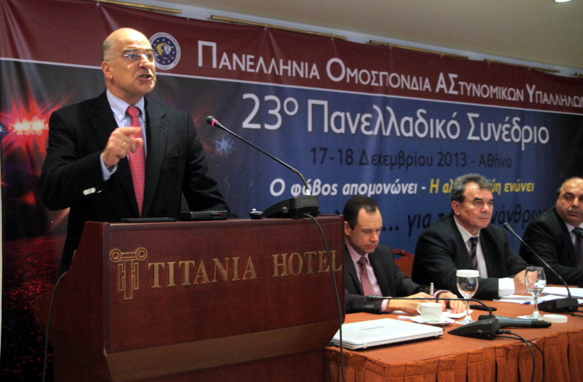 Η φωτογραφία είναι από τον χαιρετισμό που απηύθυνε ο τότε υπουργός Δημοσίας Τάξεως Νίκος Δένδιας στο συνέδριο της ΠΟΑΣΥ,της Πανελλήνιας Ομοσπονδίας Αστυνομικών Υπαλλήλων. Το συνδικαλιστικό όργανο των αστυνομικών.