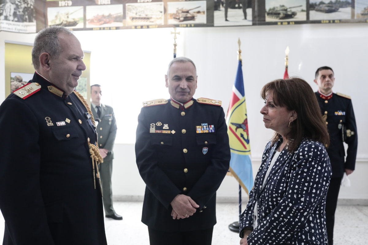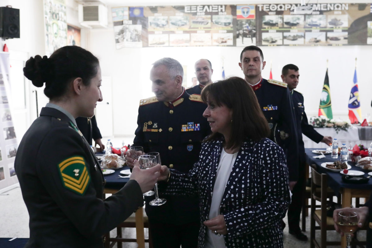 Την Πρόεδρο της Δημοκρατίας υποδέχτηκαν στο στρατόπεδο ο διοικητής του Δ’ Σώματος Στρατού, αντιστράτηγος Ιωάννης Τσιόπλος, και ο διοικητής της XXV Τεθωρακισμένης Ταξιαρχίας, ταξίαρχος Γιώργος Βασιλειάδης, ενώ άγημα απέδωσε τιμές με την ανάκρουση του Εθνικού Ύμνου.