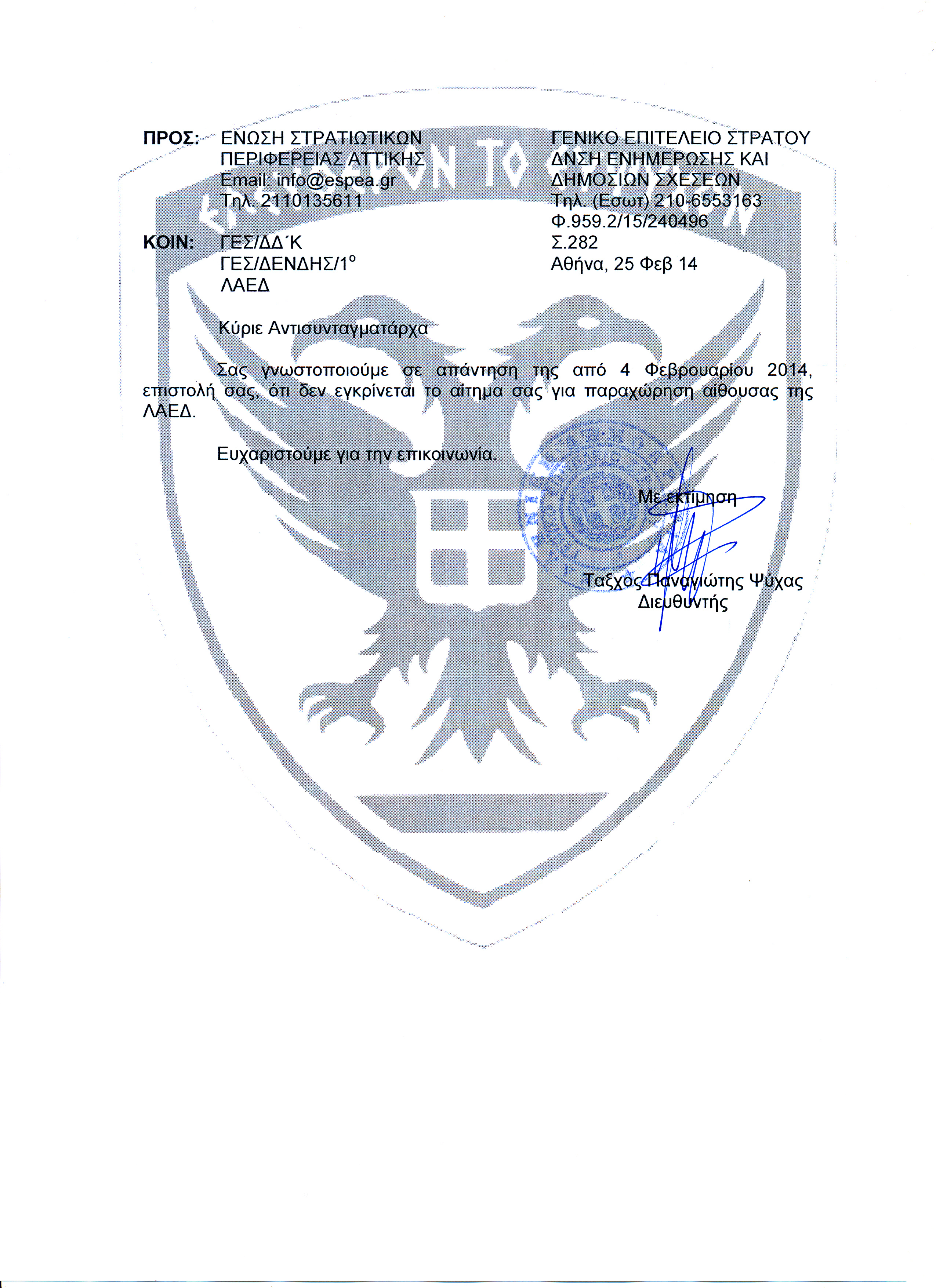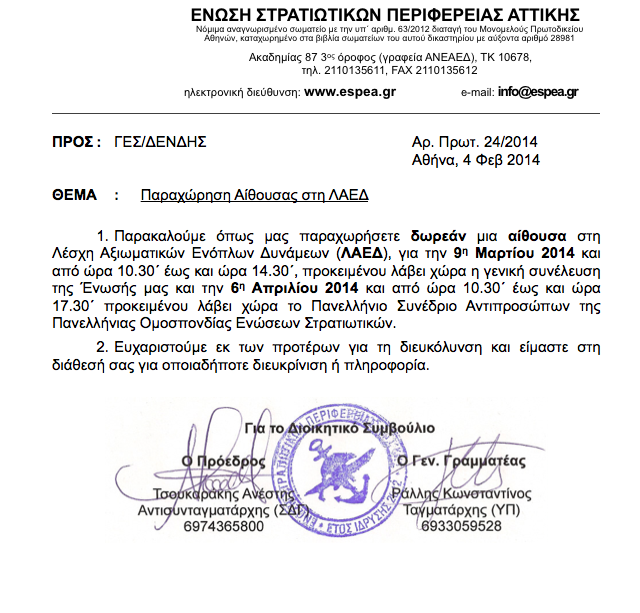 Η ΕΣΠΕΑ είχε ζητήσει με έγγραφό της να γίνει ότι και πέρυσι. Να δοθεί μια αίθουσα στην ΛΑΕΔ στις 9 Μαρτίου για να γίνει η γενική της συνέλευση. Ο χώρος θα δεσμευόταν από τις 10.30 έως τις 14.30. Με το ίδιο έγγραφο ζητούσε αίθουσα για τις 6 Απριλίου, από τις 10.30 έως τις 17.30 για να γίνει το Πανελλήνιο Συνέδριο Αντιπροσώπων της Πανελλήνιας Ομοσπονδίας Ενώσεων Στρατιωτικών. Εννοείται ότι από τις δύο εκδηλώσεις θα υπήρχαν και τα σχετικά έσοδα για την ΛΑΕΔ.