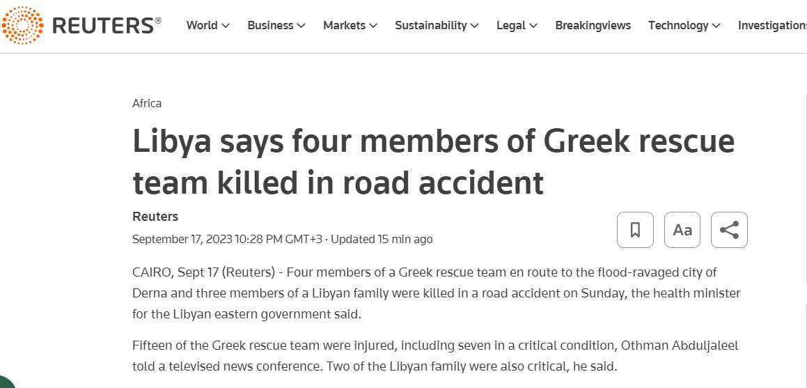 Όπως μεταδίδει το πρακτορείο Reuters «Τέσσερα μέλη μιας ελληνικής ομάδας διάσωσης καθ’ οδόν προς την κατεστραμμένη από τις πλημμύρες πόλη Ντέρνα στη Λιβύη και τρία μέλη μιας λιβυκής οικογένειας σκοτώθηκαν σε τροχαίο δυστύχημα την Κυριακή, δήλωσε ο υπουργός Υγείας της ανατολικής κυβέρνησης της Λιβύης.