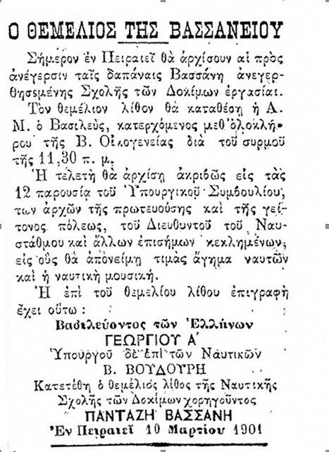 Όπως διαβάζουμε στην σχετική ανακοίνωση της εποχής «η επί του θεμελίου λίθου επιγραφή έχει ούτω: Βασιλεύοντος των Ελλήνων Γεωργίου Α’, Υπουργού δε επί των Ναυτικών Β. Βουδούρη, κατετέθη ο θεμέλιος λίθος της Σχολής Ναυτικών των Δοκίμων χορηγούντος Πανταζή Βασσάνη».
