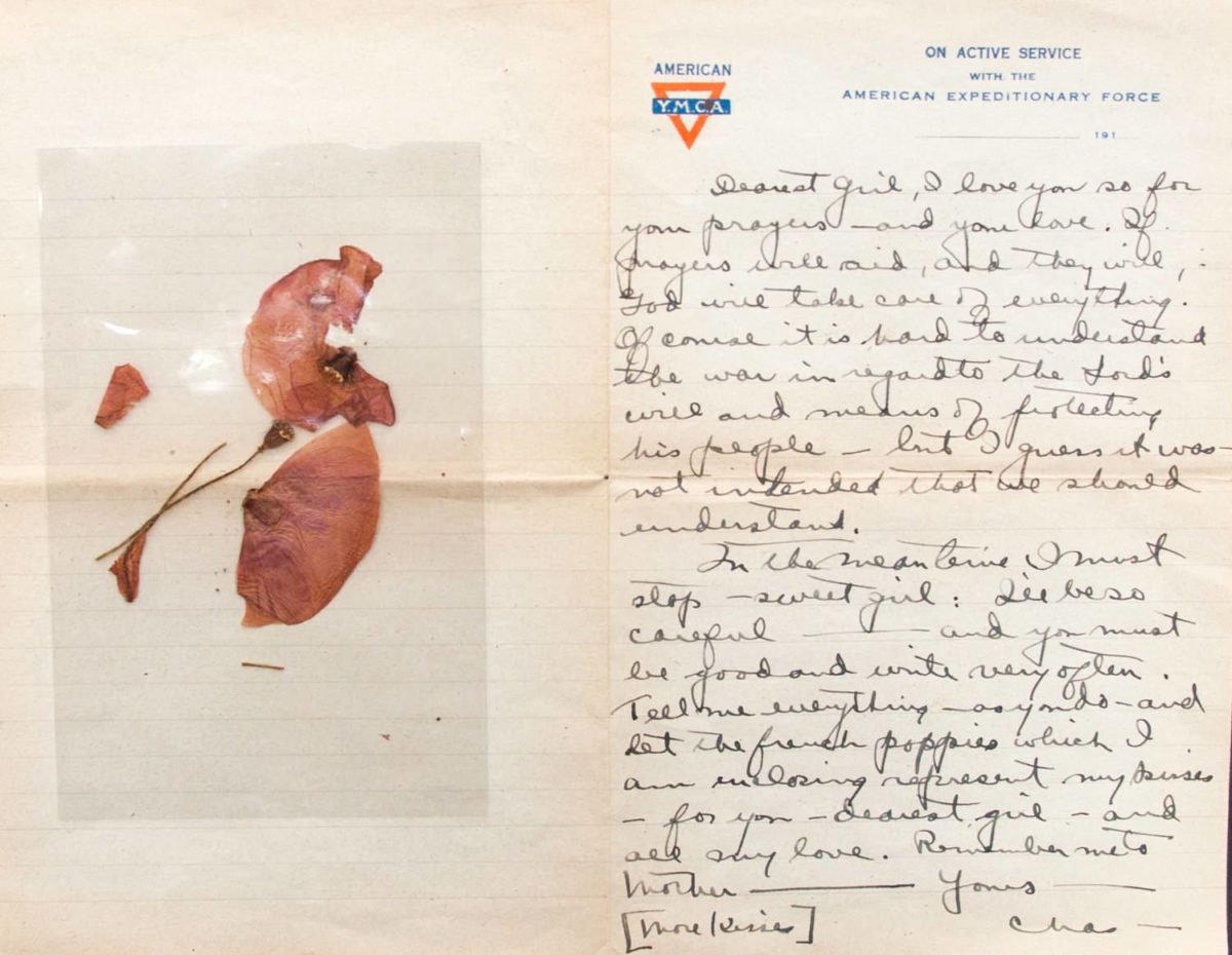Εν τω μεταξύ, θα πρέπει εδω να σταματήσω να γράφω γλυκό μου κορίτσι, θα είμαι τόσο προσεκτικός και θα πρέπει να είσαι κι εσυ καλή και να μου γράφεις πολύ συχνά. Πες μου τα πάντα, όπως κάνεις συνήθως και άσε αυτη τη γαλλική παπαρούνα που επισυνάπτω να αντιπροσωπεύει τα φιλιά μου για σένα – αγαπητό μου κορίτσι, με όλη μου την αγάπη. Χαιρετισμούς στη μητέρα – δικός σου ‘Chas’ ( κι αλλα φιλιά ). «