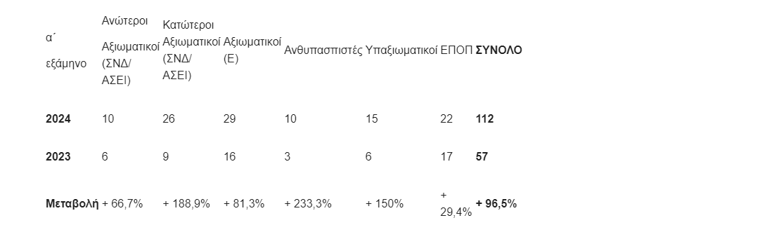 –Ο αριθμός των παραιτήσεων του α΄ εξαμήνου ανέρχεται στο 62,6% του συνόλου του 2023, ενώ όλοι οι δείκτες του α΄ εξαμήνου παρουσιάζουν τεράστια ποσοστιαία άνοδο.