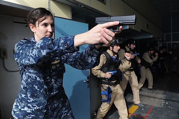 Στην φωτογραφία κάτω η η αμερικανίδα υπολοχαγός Kim Manuel, συμμετέχει σε εκπαίδευση στο πλοίο Άρης σε έφοδο με όπλο .