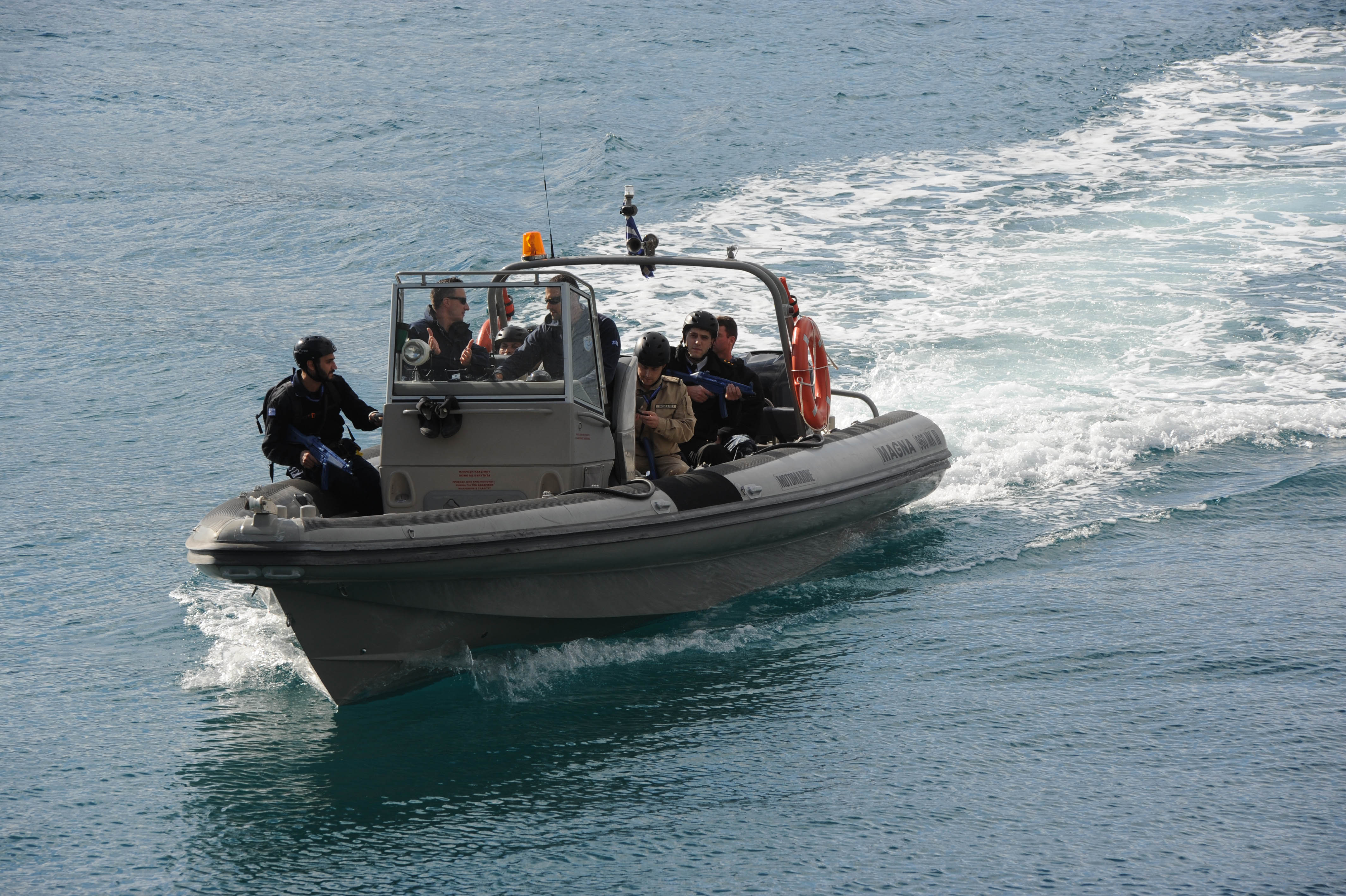 Στην τρίτη φωτογραφία μια πολυεθνική ομάδα σε πλοίο εφόδου ετοιμάζεται να επιβιβαστεί στο Ελληνικό εκπαιδευτικό πλοίο Αρης για πρακτική εφαρμογή των σεμιναρίων.