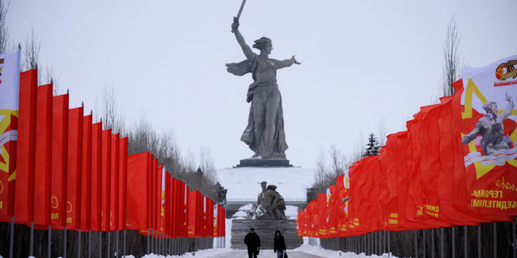 Το γιγαντιαίο μνημείο:«Η Μητέρα Πατρίδα Καλεί σε Αγώνα», γνωστό και ως το άγαλμα της Μάνας Πατρίδας, βρίσκεται στην κορυφή του λόφου-μνημείου Μαμάγιεφ, προς τιμή των πεσόντων στη Μάχη του Στάλινγκραντ κατά τη διάρκεια του Β΄ Παγκόσμιου Πολέμου, στη ρωσική πόλη Βόλγογκραντ, πρώην Στάλινγκραντ, 30 Ιανουαρίου 2013. Στο πλαίσιο της αναβίωσης του αισθήματος εθνικής υπερηφάνειας και της υπενθύμισης του ρόλου της ως παγκόσμια δύναμη, η Ρωσία αυτό το Σαββατοκύριακο τιμά και θυμάται τη νίκη του Κόκκινου Στρατού επί των γερμανικών στρατιωτικών δυνάμεων εισβολής, σε μια από τις πιο αιματηρές μάχης της ανθρώπινης ιστορίας. Φωτό: AFP/East News