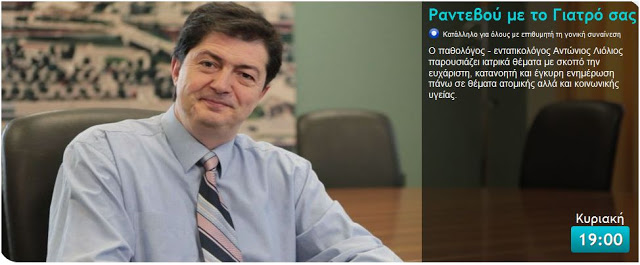 Την 30λεπτη ιατρική εκπομπή «Ραντεβού με το γιατρό σας» παρουσιάζει ο παθολόγος – εντατικολόγος Αντώνιος Λιόλιος πρώην στρατιωτικός ιατρός και σκοπός της είναι η παρουσίαση ιατρικών θεμάτων από ιατρό παρουσιαστή με σκοπό την ευχάριστη, κατανοητή και έγκυρη ενημέρωση του κοινού πάνω σε θέματα ατομικής αλλά και κοινωνικής υγείας.