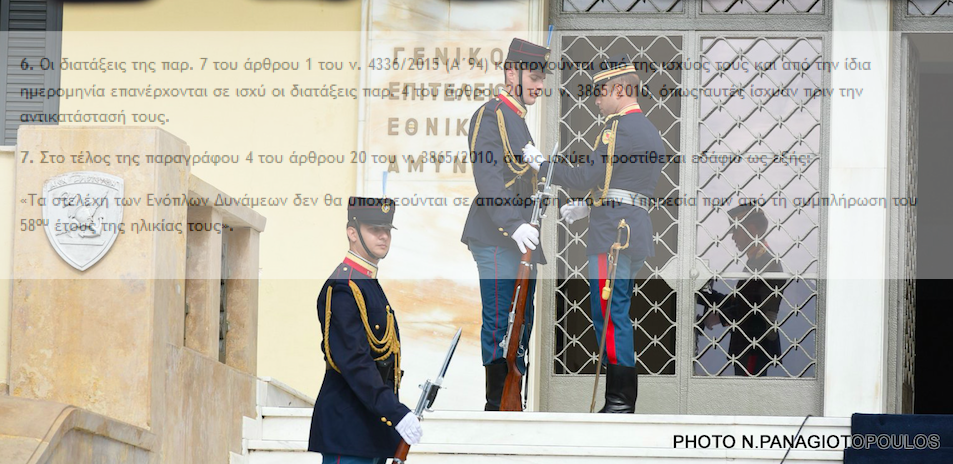 Το Σάββατο 10 Οκτωβρίου 2015 και ώρα 20.00΄ αναρτήθηκε στον επίσημο δικτυακό τόπο διαβουλεύσεων του Υπουργείου Οικονομικών σχέδιο νόμου με τίτλο: «ΜΕΤΡΑ ΓΙΑ ΤΗΝ ΕΦΑΡΜΟΓΗ ΤΗΣ ΣΥΜΦΩΝΙΑΣ ΔΗΜΟΣΙΟΝΟΜΙΚΩΝ ΣΤΟΧΩΝ ΚΑΙ ΔΙΑΡΘΡΩΤΙΚΩΝ ΜΕΤΑΡΡΥΘΜΙΣΕΩΝ», στις διατάξεις του άρθρου 1 του οποίου, μεταξύ των άλλων, εμπεριέχονται παράγραφοι ως εξής: «6. Οι διατάξεις της παρ. 7 του άρθρου 1 του ν. 4336/2015 (Α΄94) καταργούνται από της ισχύος τους και από την ίδια ημερομηνία επανέρχονται σε ισχύ οι διατάξεις παρ. 4 του άρθρου 20 του ν. 3865/2010, όπως αυτές ίσχυαν πριν την αντικατάστασή τους. 7. Στο τέλος της παραγράφου 4 του άρθρου 20 του ν. 3865/2010, όπως ισχύει, προστίθεται εδάφιο ως εξής: «Τα στελέχη των Ενόπλων Δυνάμεων δεν θα υποχρεούνται σε αποχώρηση από την Υπηρεσία πριν από τη συμπλήρωση του 58ου έτους της ηλικίας τους».