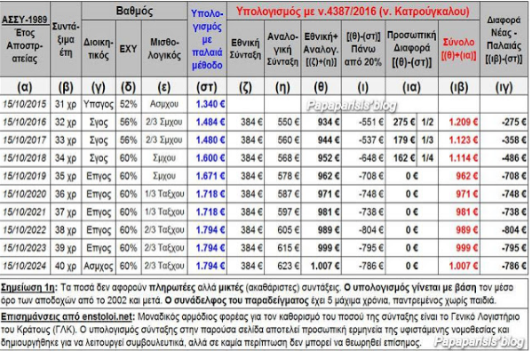 (1) Σύνταξη το 2015 και μέχρι εφαρμογής του ν.4387/2016, υπολογίζεται με βάση τον παλαιό τρόπο υπολογισμό. Βασική (μικτή) σύνταξη 1.340 ευρώ.