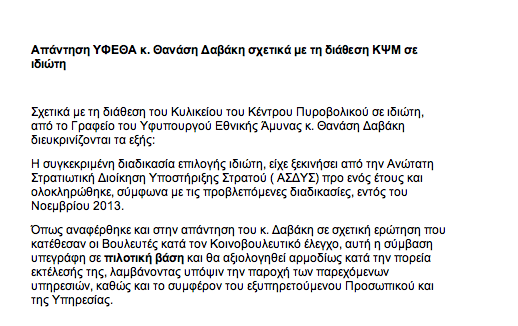 Προσεκτική η απάντηση του υφυπουργού Εθνικής Άμυνας στο δημοσίευμα του Onalert για την ιδιωτικοποίηση των ΚΨΜ. Ο κ.Δαβάκης επαναλαμβάνει ότι η σύμβαση για το ιδιωτικό ΚΨΜ υπεγράφη σε πιλοτική βάση “και θα αξιολογηθεί αρμοδίως”. Στην αξιολόγηση πρέπει νομίζουμε να απαντηθούν και τα ερωτήματα που μεταφέρουν οι στρατιωτικοί και τα οποία δημοσιεύσαμε. Και βέβαια αν πρέπει σώνει και καλά να ιδιωτικοποιήσουμε και τα ΚΨΜ αυτό σε καμία περίπτωση δεν μπορεί να γίνει με διαγωνισμούς στους οποίους εμφανίζεται …ένας.