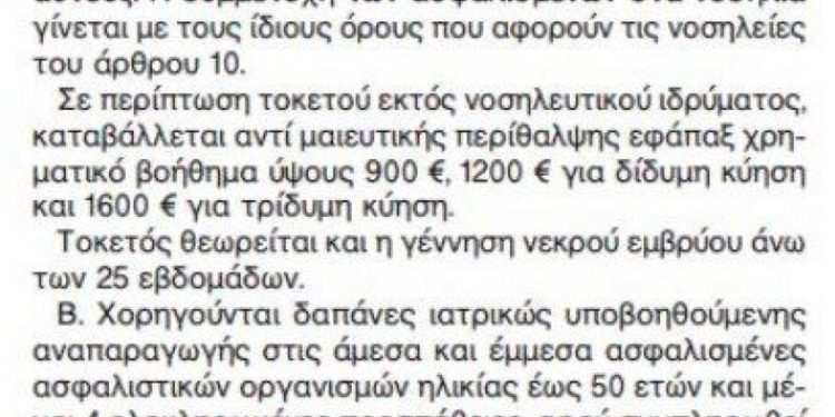 Όμως, για τις μητέρες, που θα προτιμήσουν να φέρουν το παιδί τους στο κόσμο μέσα στο… σπίτι τους, μέσα σε ένα ταξί, στην εξοχή ή ακόμη και στο δρόμο, ο ΕΟΠΥΥ θα παρέχει εφάπαξ επίδομα τοκετού, το οποίο φτάνει τα 900 ευρώ για το ένα παιδί, τα 1.200 ευρώ για τα δίδυμα και τα 1.600 ευρώ για τα τρίδυμα».