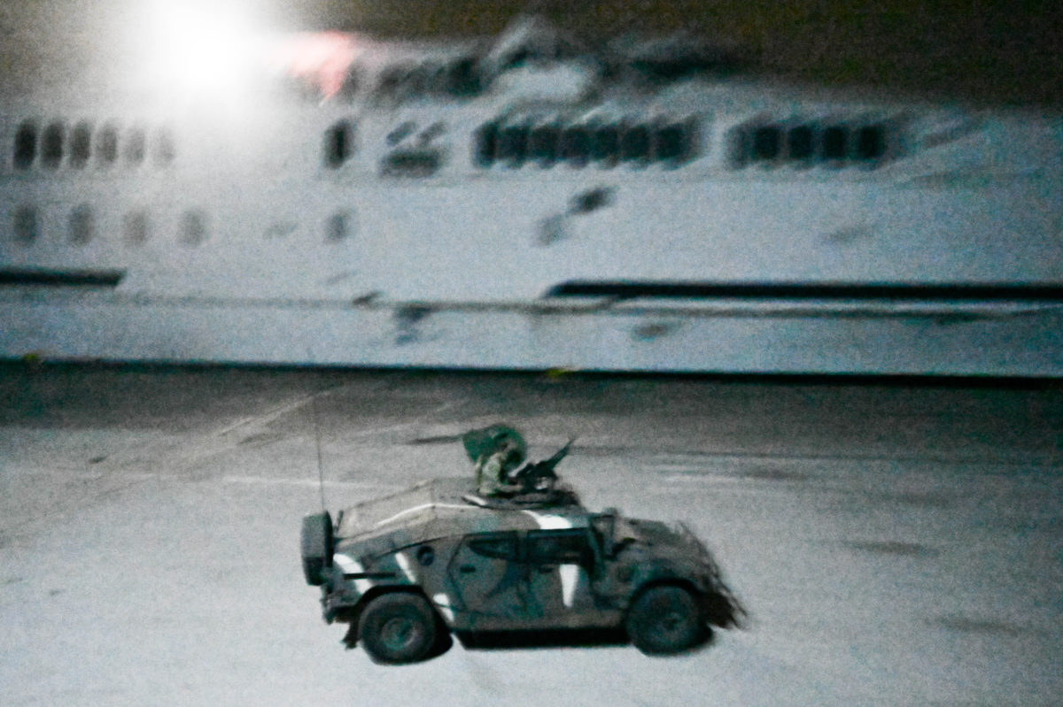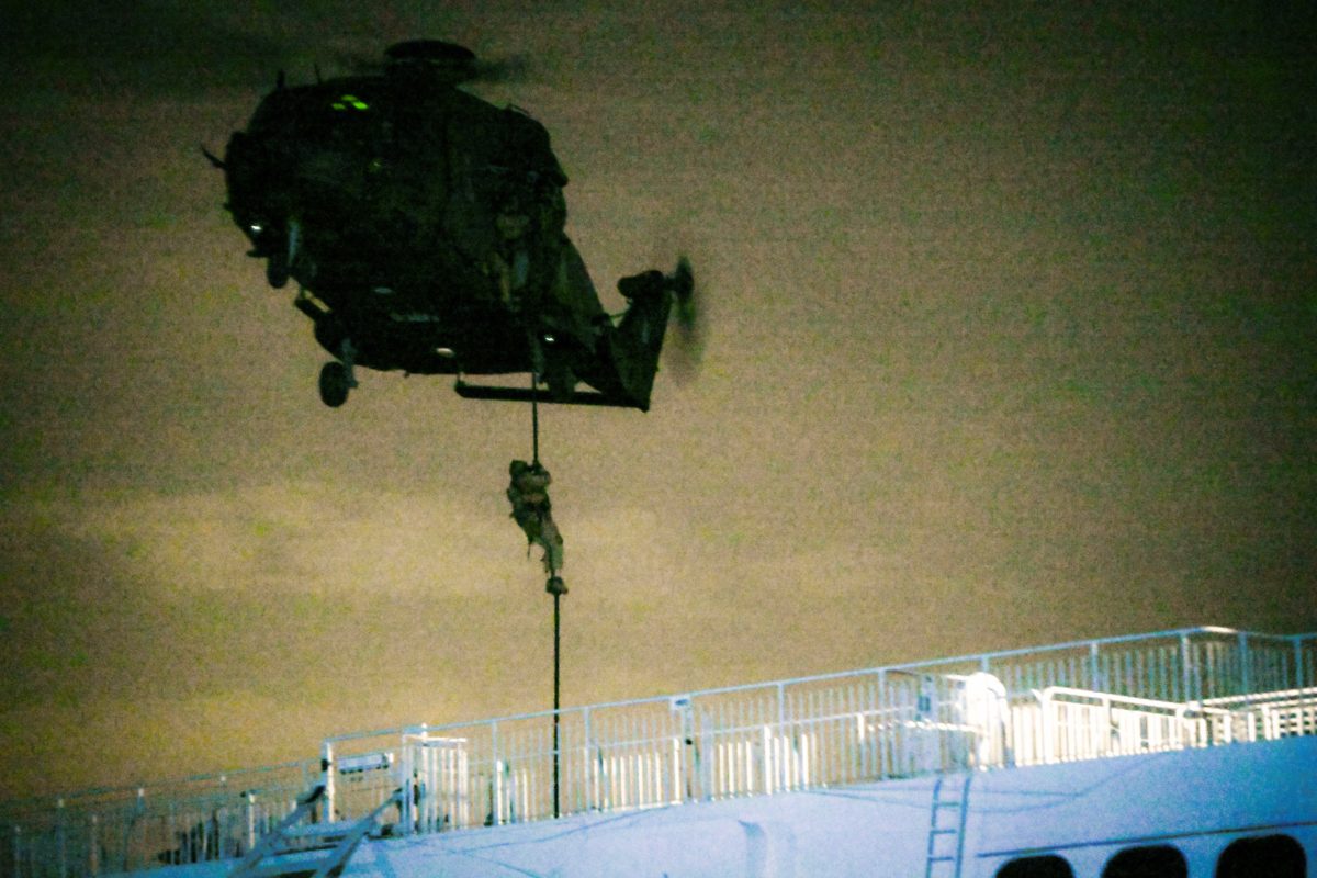 Την ίδια ώρα, ομάδα εφόδου πραγματοποίησε καταρρίχηση με τη μέθοδο fast rope στο κατάστρωμα του αγκυροβολημένου πλοίου από ελικόπτερο NH-90, ενώ προσέγγισαν και 2 ταχύπλοα σκάφη τύπου Viking που αποβιβάζουν ετέρα ομάδα εφόδου, προβαίνοντας σε εξουδετέρωση της εχθρικής απειλής.
