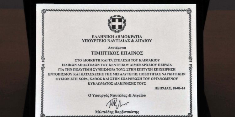 Τιμητικό έπαινο προς τα στελέχη του Λιμενικού Σώματος που συμμετείχαν στην επιτυχή επιχείρηση εντοπισμού μεγάλης ποσότητας ναρκωτικών ουσιών και την εξάρθρωση του οργανωμένου κυκλώματος διακίνησής τους, απένειμε σήμερα ο Υπουργός Ναυτιλίας και Αιγαίου, Μιλτιάδης Βαρβιτσιώτης.