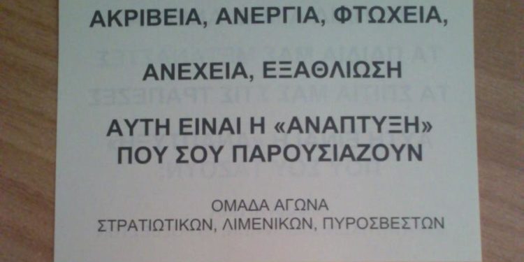 “Ακρίβεια,ανεργία,φτώχεια,ανέχεια,εξαθλίωση,αυτή είναι η “ανάπτυξη” που σου παρουσιάζουν”, γράφουν στο ένα και στο δεύτερο “τα παιδιά μας άνεργα,τα παιδιά μας μετανάστες,τα σπίτια μας στις τράπεζες, αυτή είναι η “ανάπτυξη” που σου τάζουν;”