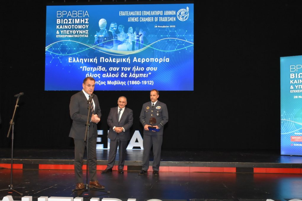 Μετά τις βραβεύσεις επιχειρήσεων, ο ΥΕΘΑ μαζί με τον Πρόεδρο του Επαγγελματικού Επιμελητηρίου Αθηνών κ. Ιωάννη Χατζηθεοδοσίου απένειμαν ειδικό τιμητικό βραβείο στον Αρχηγό ΓΕΑ Αντιπτέραρχο (Ι) Θεμιστοκλή Μπουρολιά για την προσφορά της Πολεμικής Αεροπορίας στο κοινωνικό σύνολο. Στην τελετή παρευρέθηκαν επίσης Υπουργοί, βουλευτές και εκπρόσωποι κομμάτων και της Αυτοδιοίκησης. Παρόντες ήταν, επίσης, εκπρόσωποι επιχειρηματικών ομίλων, πρόεδροι και μέλη διοικήσεως επιμελητηρίων, καθώς και φορέων και κοινωνικών εταίρων.