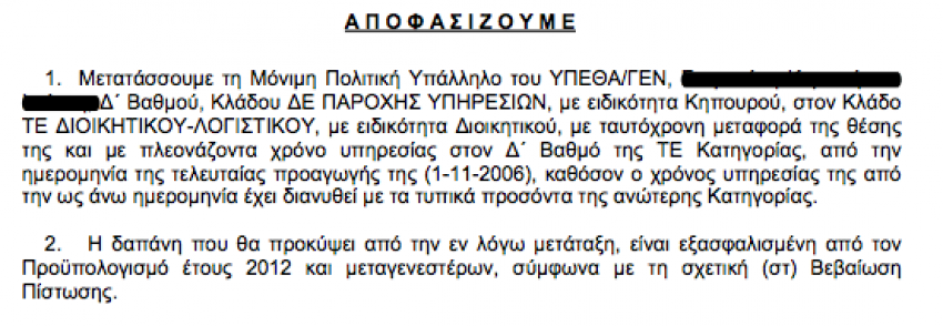 Όσοι νομίζουμε ότι στην Ελλάδα της κρίσης και του ΔΝΤ μπορεί μέσα στη μιζέρια μας κάτι ν΄ αλλάξει ,τουλάχιστον σε επίπεδο νοοτροπίας συνεχώς χάνουμε. Γιατί διαπιστώνουμε ότι τίποτα δεν αλλάζει. Απόδειξη η απόφση που δημοσιεύουμε και δείχνει ότι υπάλληλος του υπουργείου Εθνικής Άμυνας με ειδικότητα κηπουρού μετατάσσεται έτσι απλά με μια απόφαση στον κλάδο διοικητικού-λογιστικού με ειδικότητα Διοικητικού.