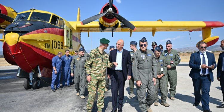 Στην 355 ΜΤΜ της 112 ΠΜ στην Ελευσίνα, την έδρα της αεροπυρόσβεσης στη χώρα μας, συνοδευόμενος από τον Αρχηγό ΓΕΕΘΑ Στρατηγό Δημήτριο Χούπη και τον Αρχηγό ΓΕΑ Αντιπτέραρχο (Ι) Δημοσθένη Γρηγοριάδη. Με τους ιπτάμενους, τους μηχανικούς και τους τεχνικούς της Πολεμικής Αεροπορίας… pic.twitter.com/QMmbKZSVwC