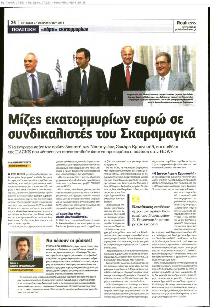 Οι συνδικαλιστές σύμφωνα με τις καταθέσεις που υπάρχουν έπρεπε να ικανοποιηθούν ώστε να προχωρήσει η πώληση των ναυπηγείων προς τους Γερμανούς. Ανταγωνιστές τότε ήταν οι Γάλλοι.