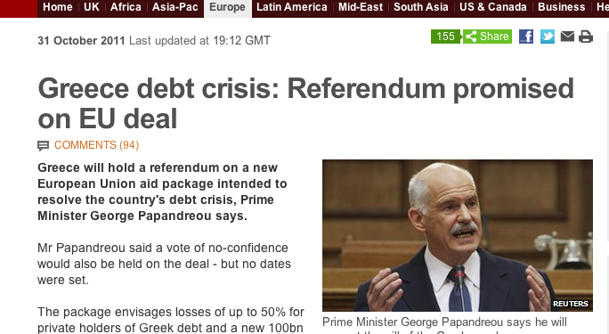 «Το δημοψήφισμα για τους Έλληνες θα είναι σαν να ρωτάνε τις γαλοπούλες αν θέλουν να ψηθούν τα Χριστούγεννα». Αυτό ήταν το σχόλιο του BBC για την ανακοίνωση Παπανδρέου για το δημοψήφισμα.