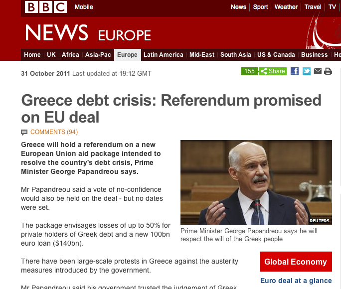 «Το δημοψήφισμα για τους Έλληνες θα είναι σαν να ρωτάνε τις γαλοπούλες αν θέλουν να ψηθούν τα Χριστούγεννα». Αυτό ήταν το σχόλιο του BBC για την ανακοίνωση Παπανδρέου για το δημοψήφισμα.