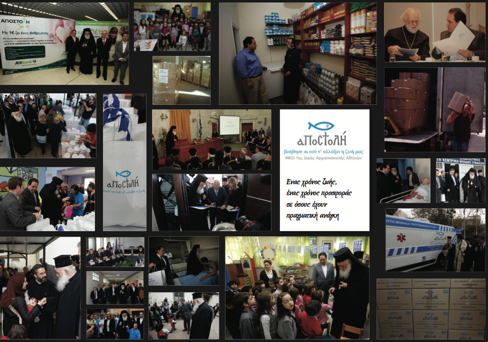 Η Μ.Κ.Ο. «ΑΠΟΣΤΟΛΗ» προσέφερε τα ως άνω είδη στην Μ.Κ.Ο. «ΑΓΚΑΛΙΑ» Λέσβου, στην Παγκόσμια Ένωση Αλβανικής Μετανάστευσης, στους μετανάστες απεργούς που φιλοξενούνται στο κτίριο Υπατία (εμφιαλωμένο νερό), στους Σέρβους και Αλβανούς του Κοσσόβου σε συνεργασία με την Ιερά Μητρόπολη Νεαπόλεως και Σταυρουπόλεως, στον Πανελλήνιο Σύλλογο Παραπληγικών Ελλάδος, στην Ιερά Μονή Ιωάννου Θεολόγου (Βάγια Βοιωτίας), στον Ιερό Ναό Αγίου Παύλου (Ι. Μ. Περιστερίου), στον Ιερό Ναό Αγίου Νικολάου (Ι. Αρχιεπισκοπή Αθηνών). Επίσης προσέφερε ανθρωπιστική βοήθεια σε 13 άπορες οικογένειες και ενίσχυσε το πρόγραμμα «Η Εκκλησία στους δρόμους», μέσω του οποίου διανέμονται καθημερινά 1.600 μερίδες φαγητού σε αστέγους, μετανάστες και άλλες ευπαθείς κοινωνικές ομάδες.