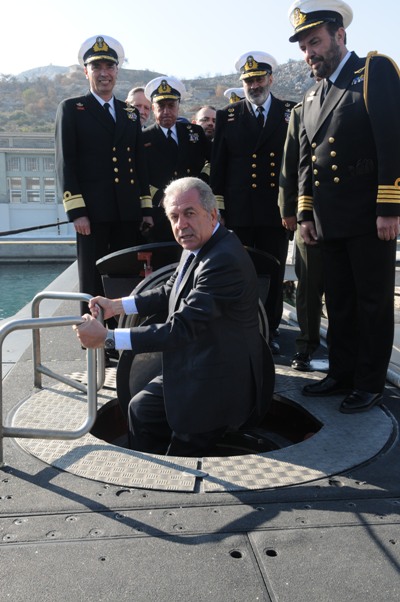 Ο ΥΕΘΑ πήγε επίσης στο υποβρύχιο ΠΡΩΤΕΥΣ και στη φρεγάτα ΣΠΕΤΣΑΙ. Ο Α/ΓΕΝ του έκανε δώρο κυαλιά από την εποχή του πολέμου για «να δείτε το όραμα που έχουμε και να μας καθοδηγήσετε»,όπως του είπε. Ο Δ.Αβραμόπουλος είπε ότι τον προτρέπει «να κοιτάξουμε πολύ μακρυά» και φάνηκε μάλλον συγκινημένος από το δώρο.