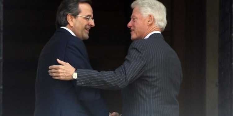 Ο κ.Κλίντον συναντήθηκε με τον Έλληνα πρωθυπουργό κ. Σαμαρά, ο οποίος τον αποκάλεσε «φίλο της Ελλάδας», γράφει Ο κ. Σαμαράς τον ευχαρίστησε για τις προσπάθειες που ξεκίνησε με Έλληνες και Αμερικανούς επιχειρηματίες για τη δημιουργία ταμείου που θα υποστηρίξει τις δραστηριότητες για την ανάπτυξη της Ελλάδας.