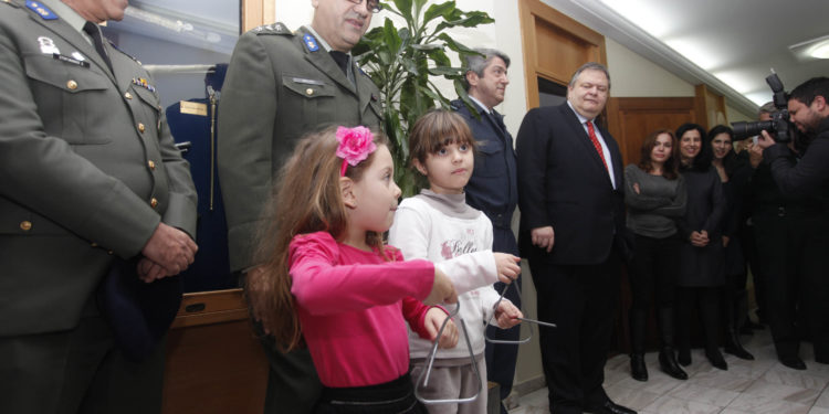 Από δύο κοριτσάκια …τ΄ άκουσε ο Βενιζέλος,έξω από το γραφείο του στο υπουργείο Άμυνας. Τα πρωτοχρονιάτικα κάλαντα εννοείται. Δίπλα του δεν ήταν μόνο οι συνεργάτες του αλλά και η σύζυγός του και η κόρη του. Και του χρόνου.