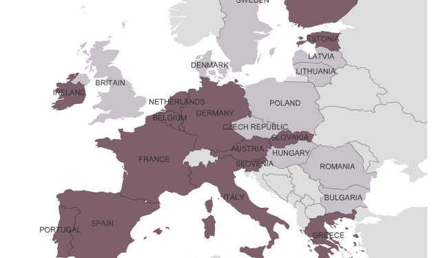 Στο χάρτη βλέπετε τις χώρες που αποτελούν την Ευρωζώνη. Οι New York Times δημοσίευσαν μία σειρά χαρτών και γραφημάτων που δείχνουν το σοβαρόο πρόβλημα χρέους της Ελλάδας,αλλά αποδεικνύουν ότι δεν είμαστε οι μοναδικοί που έχουμε αυτό το βραχνά. Όπως γράφουν 14 από τις 27 χώρες της Ευρωζώνης έχουν χρέος πάνω από το 60% του ΑΕΠ τους. Εμείς είμαστε στη κορυφή με 143% και ακολουθεί η Ιταλία με 106%! Γι΄ αυτό και οι δύο χώρες είναι χρωματισμένες με κόκκινο. Όσες χώρες έχουν χρώμα κίτρινο έχουν ποσοστά πάνω από 80%. Οι πράσινες ακόμη δεν ανησυχούν.