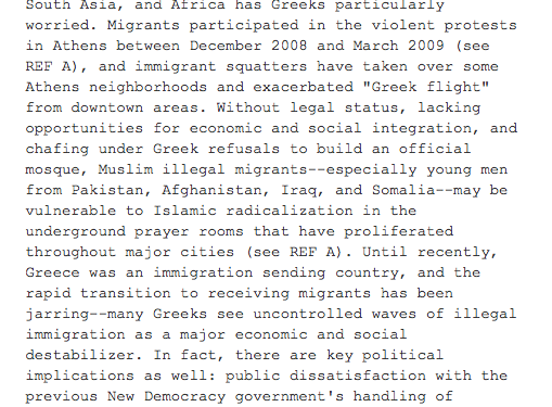 “Όλοι αυτοί και ειδικά οι νέοι άνδρες από το Πακιστάν ,το Αφγανιστάν,το Ιράκ και τη Σομαλία «πατώντας» και στην άρνηση της Ελλάδας να κατασκευάσει ένα τζαμί, είναι ευάλωτοι στη «ριζοσπαστικοποίηση» μέσα στα υπόγεια διαμερίσματα που πολλαπλασιάζονται στις πόλεις».