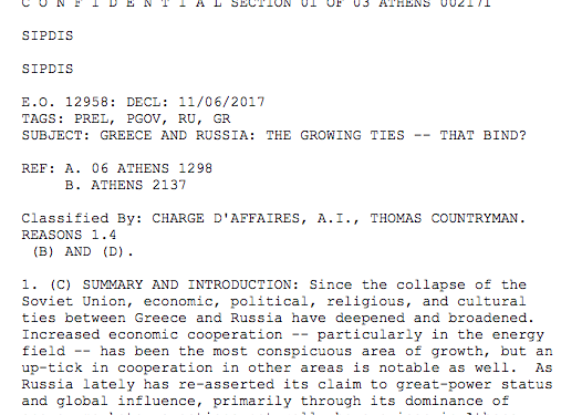 Wikileaks:οι ΗΠΑ ανησυχούσαν για τις σχέσεις Αθήνας-Μόσχας.