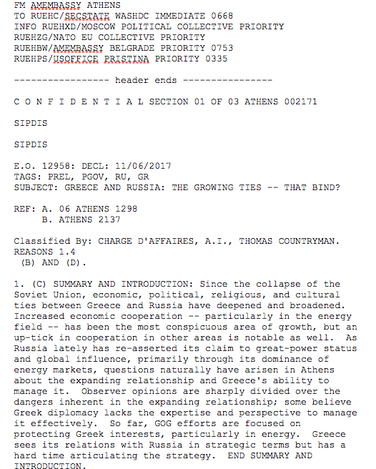 Στο τηλεγράφημα αναφέρεται ότι «Ρώσοι πράκτορες θα µπορούσαν ναδιεισδύσουν στην ελληνική οικονοµία», λόγω της αυξανόµενης δύναµης των siloviki (πρώην και νυν στελέχη ασφάλειας και µυστικών υπηρεσιών που κατέχουν επιφανείς θέσεις στη Ρωσία του Πούτιν). Στο σχόλιό του ο αµερικανός επιτετραµµένος έγραφε: «Είναι ξεκάθαροότι οι Ελληνες απολαµβάνουν το κόρτε των Ρώσων, ακόµα και αν το παίζουν συχνά δύσκολοι».
