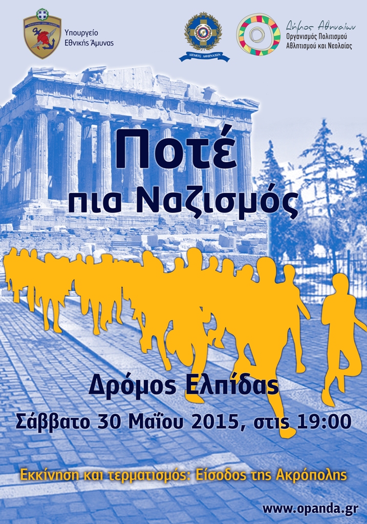 Στην Αθήνα, το Σάββατο 30 Μαΐου 2015 διεξάγεται ο ανοιχτός λαϊκός αγώνας δρόμου, μήκους 5.500 μέτρων, ο «Δρόμος Ελπίδας», με το σύνθημα «Ποτέ πια ναζισμός». Διοργανωτές το Υπουργείο Εθνικής Άμυνας και ο Οργανισμός Πολιτισμού Αθλητισμού Νεολαίας του Δήμου Αθήνας (ΟΠΑΝΔΑ).