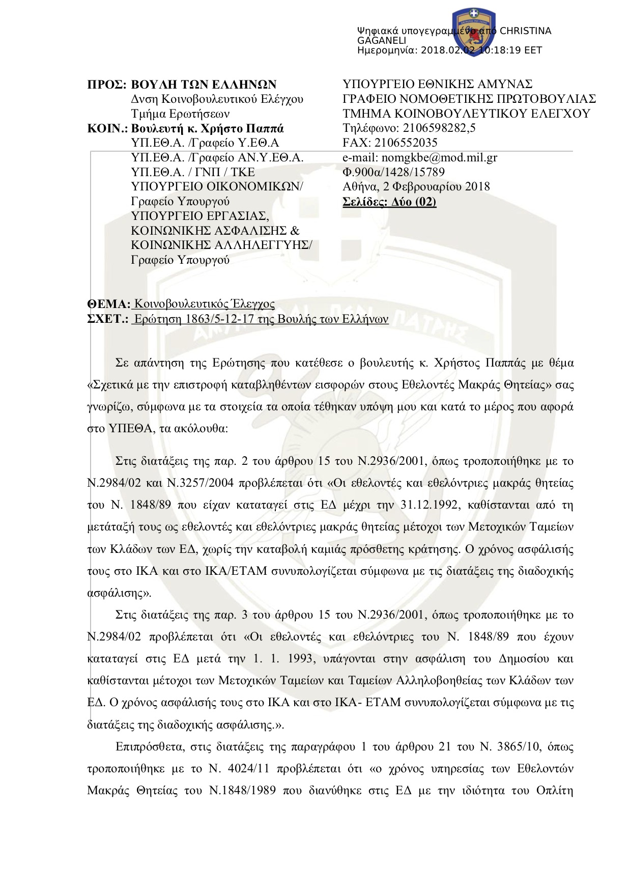 Σε απάντηση της Ερώτησης που κατέθεσε ο βουλευτής κ. Χρήστος Παππάς με θέμα «Σχετικά με την επιστροφή καταβληθέντων εισφορών στους Εθελοντές Μακράς Θητείας» σας γνωρίζω, σύμφωνα με τα στοιχεία τα οποία τέθηκαν υπόψη μου και κατά το μέρος που αφορά στο ΥΠΕΘΑ, τα ακόλουθα: