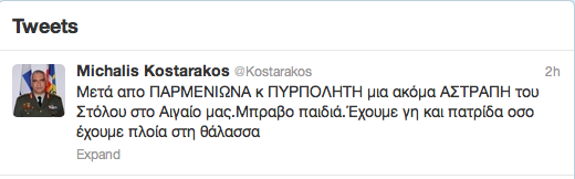 Τώρα για τα σχόλια που ακούστηκαν για τη χρονική σύμπτωση του tweeter του κ.Κωσταράκου με τις «φαντασιώσεις» περί «ναυμαχιών» εμείς δεν θα σχολιάσουμε τίποτα.