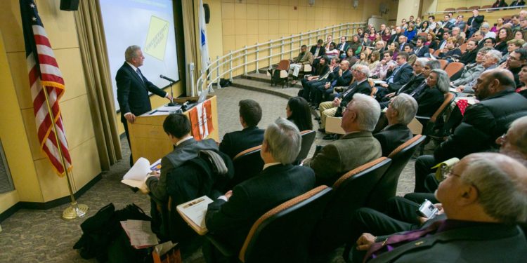 Τον κ. Αβραμόπουλο υποδέχθηκε ο Πρύτανης του Fletcher, Ναυάρχος James Stavridis, ο οποίος έχει διατελέσει Ανώτατος Στρατιωτικός Διοικητής του ΝΑΤΟ, ενώ προλόγισε ο Κώστας Αχ. Καραμανλής.