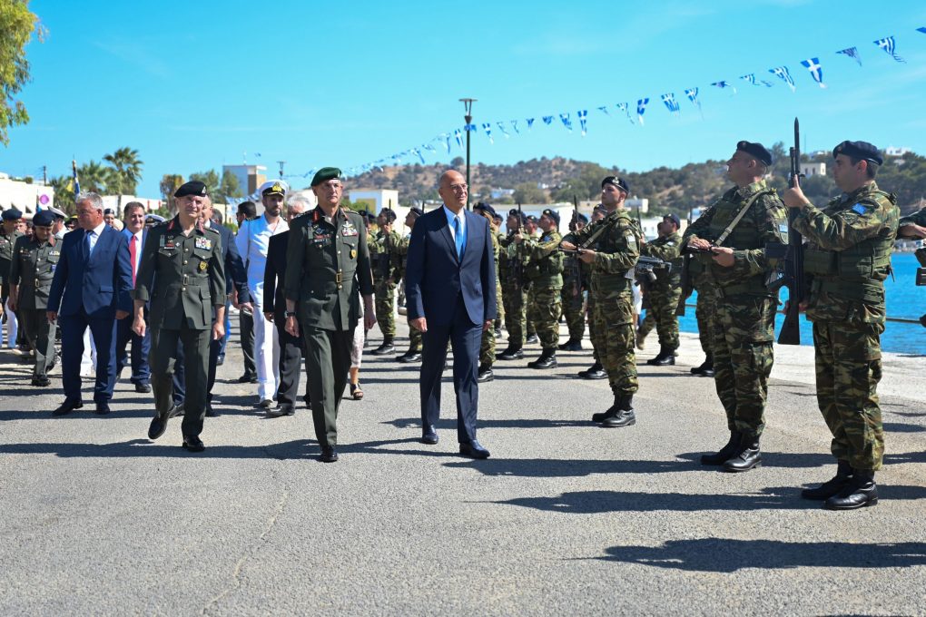 Η Ελληνική Πολιτεία δεν είναι σήμερα εδώ όμως μόνο για να αποτίσει τον δέοντα φόρο τιμής. Είναι και για να υποδηλώσει ότι οι Ένοπλές Δυνάμεις παραμένουν αρωγός στη κοινωνία της Λέρου και στους κατοίκους των Δωδεκανήσων και εν ειρήνη. Σε όλες τις δυσχερείς καταστάσεις που ίσως κληθούν να αντιμετωπίσουν. Είναι καθήκον των Ελληνικών Ενόπλων Δυνάμεων και μεγάλη τους προτεραιότητα να στηρίζουν τις κοινωνίες στις ακριτικές μας περιοχές.