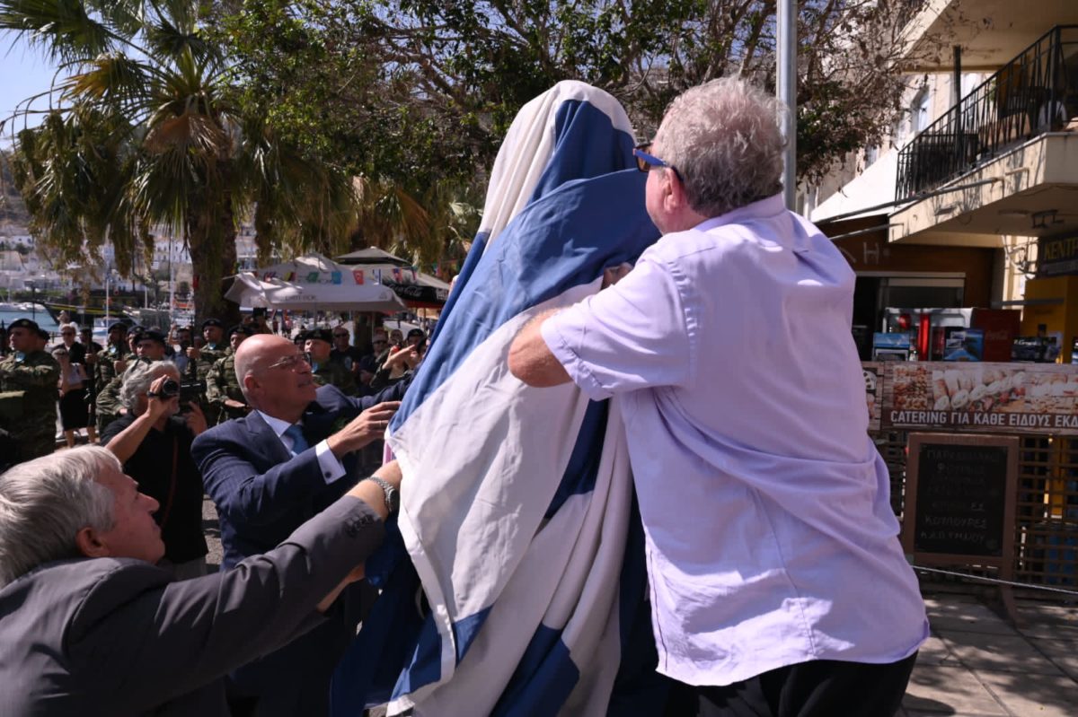 Στη συνέχεια μετέβη στο σημείο όπου έχει τοποθετηθεί ο ανδριάντας του Ανδρέα Μιαούλη, όπου τελέσθηκε επιμνημόσυνη δέηση και έγιναν τα αποκαλυπτήρια από τον Υπουργό Εθνικής Άμυνας και τον Δήμαρχο Καλυμνίων Δημήτρη Διακομιχάλη.