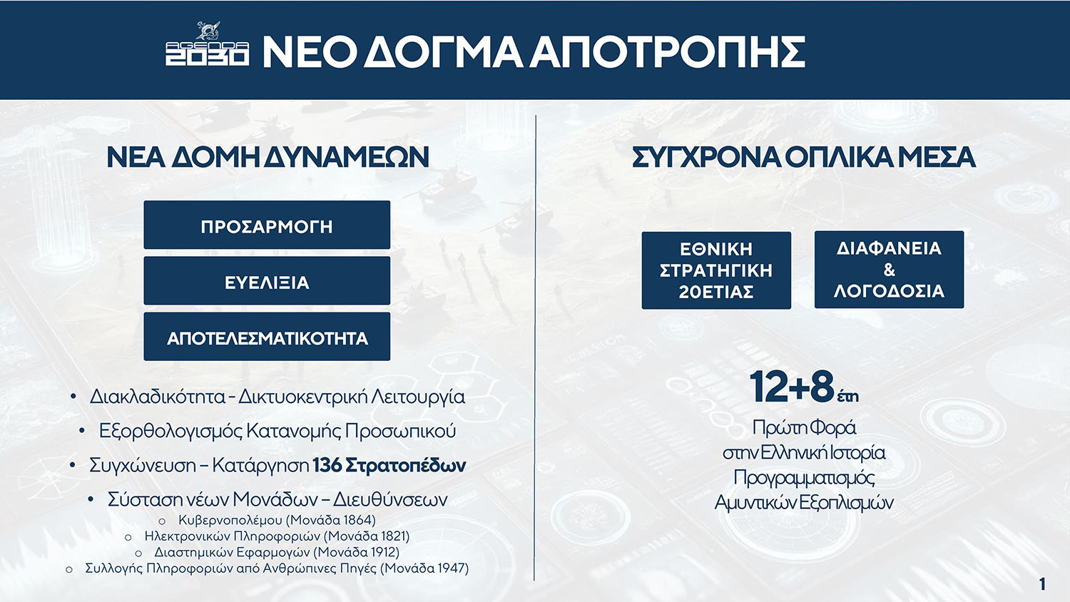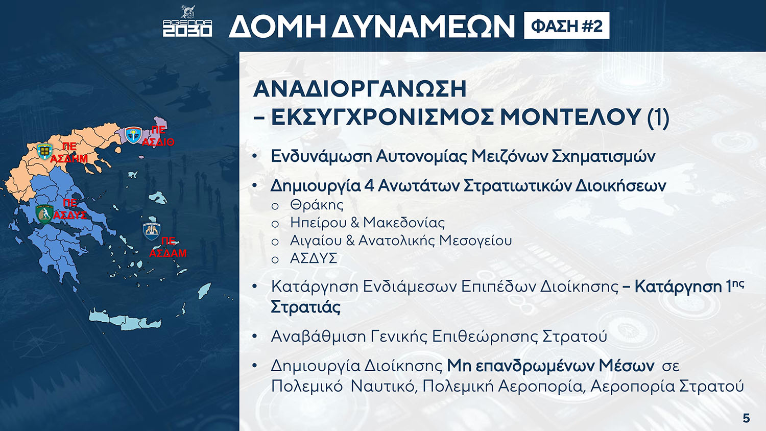 «Προχωράμε σε μια ενδυνάμωση της αυτονομίας των μειζόνων σχηματισμών, δημιουργώντας τέσσερις Ανώτατες Στρατιωτικές Διοικήσεις. Την Ανώτατη Στρατιωτική Διοίκηση Θράκης, ό,τι δηλαδή σήμερα είναι το 4ο Σώμα Στρατού. Την Ανώτατη Στρατιωτική Διοίκηση Ηπείρου και Μακεδονίας, την Ανώτατη Στρατιωτική Διοίκηση Αιγαίου και Ανατολικής Μεσογείου και την ΑΣΔΥΣ, η οποία διατηρεί τον ρόλο που έχει σήμερα.